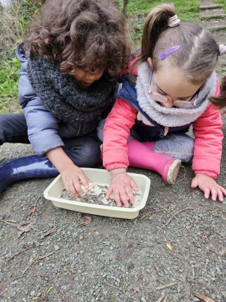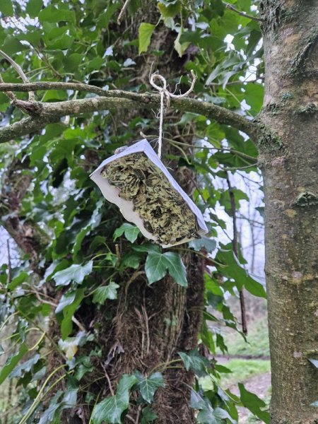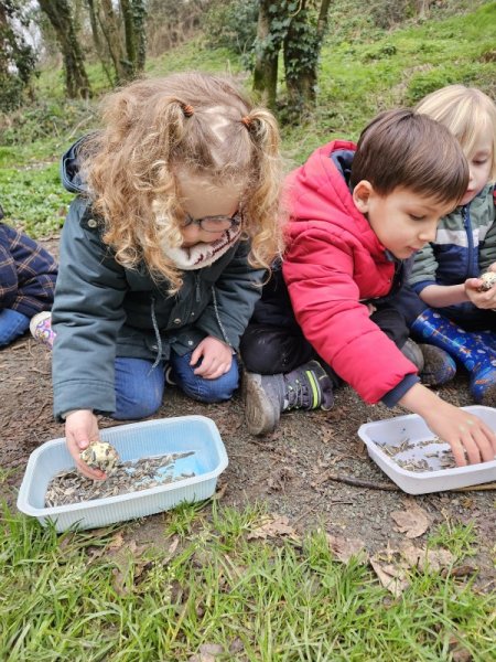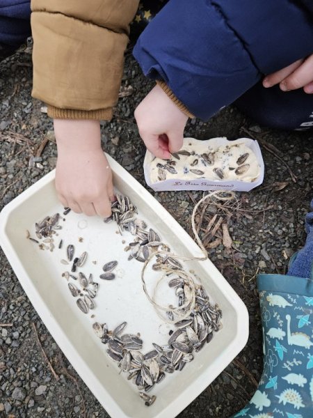 La mission, si vous l’acceptez : mettre de la nourriture à disposition des oiseaux pour terminer l’hiver. Nous avons mélanger des graines à de la margarine. Nous avons rempli nos petites boites et les avons suspendues dans les arbres.